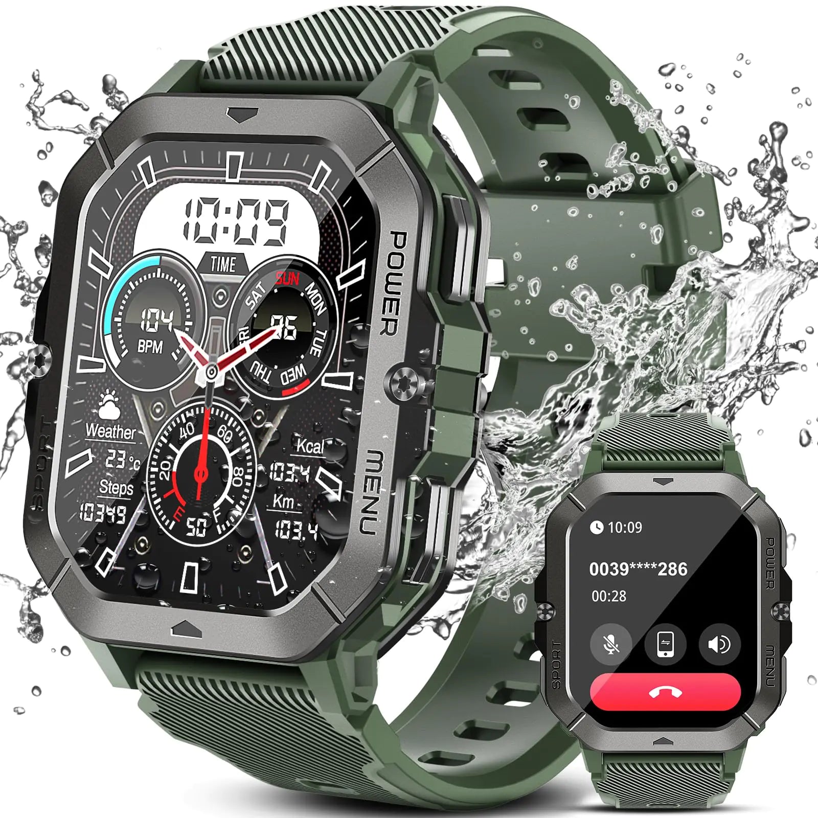 [【5ATM Waterproof Military Smart Watch】The military smart watch for men is made of solid meterail zinc alloyand the smartwatch is anti-impactshockproof and dustproof for professional outdoor sports and adventures. Especially it can keep mormal function even in very low -30℃ and high 70℃ temperatures.This men’s smartwatch is IP68 waterproof.You can wear it to the deepth of water up to 50mand the smartwatch still keep your data accurate 【Bluetooth Calls & Message Notification】Connect your smartwatch to your cell phone via the APP "Da Fit" you can make phone calls and play music via smart watch bluetooth. You can also receive message reminders on your watch from the social APP such as Facebook Twitter Ins SMSSNS etc.The smart watch has the voice assistant functionand you can ask question or set on your wrist smart watch 【100+ Sport Modes & Health Monitor】The fitness smart watch is equipped with the latest chips and sensor real-time detect your health data such as heart rate SpO2 blood pressure stress sleep time and quality. Men‘s sport smartwatch supports 100+ sports modes such as running hiking cycling basketball football etc. You can select and set the exercise mode you want in the APP "Da Fit". Connecting the "Da Fit" with Strava all sport records can be synchronized to strava and keep 【Large Battery & 2.02" HD Touch Screen】Military smart watch has 410mAh battery capacity with low power mode time up to 25-30 days and daily usage time up to 5-7 days. 2.02\\ HD touch screen with 320*390 PPI 99.5% sRGB Color Gamutproviding you with high-definition visuals and a smooth touch operating experience. The fitness tracking watch is equipped with a magnetic charging port only takes 2.5 hours to fully charge 【Multifunctional Smart Watch】The smartwatch has multiple functionsand you can ask the weather forecast set alarm clock and play music by vioce assistant. Otherwise there are some functions such as camera control calendar calculator alarm clock find phone etc. You can custom smart watch face multiple fashion smartwatch face for your choice]